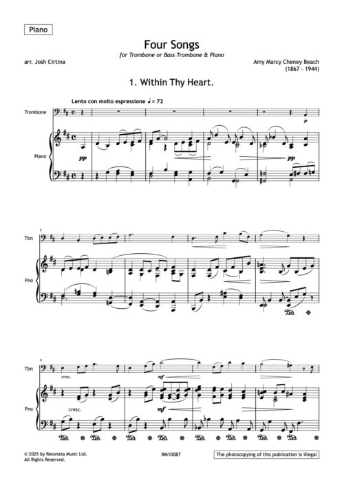 Beach – Four Songs, op. 29 for Trombone (or Bass Trombone) & Piano (PDF Download)